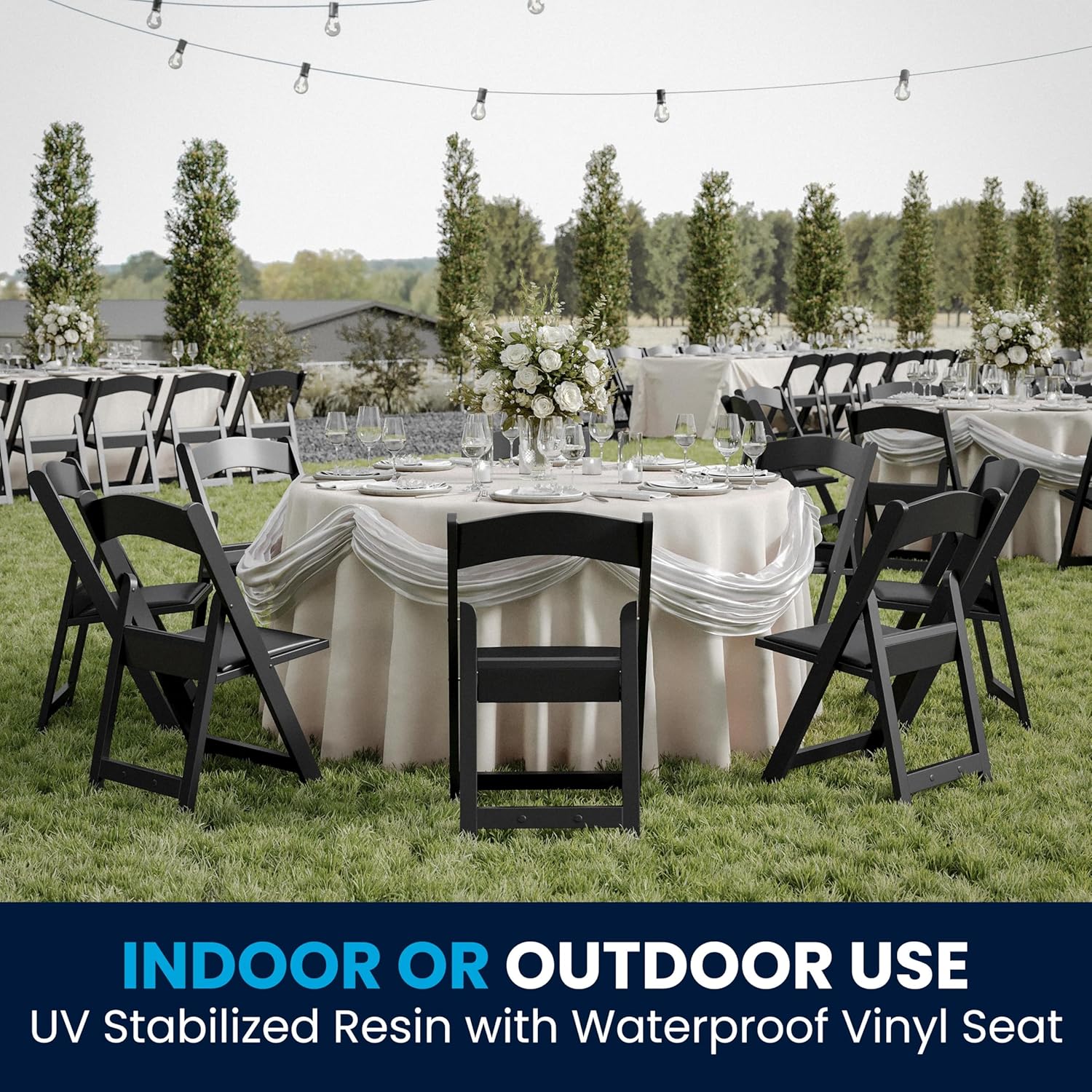 Always be ready for your next event or get-together with the Flash Furniture Hercules Series Folding Chairs. Whether you're hosting a game night or catering event, planning weddings or business meetings, or organizing a school function, this set of 4 folding chairs offers a reliable, on-demand seating solution for commercial or home use. The folding chairs have an ultra-lightweight design and feature protective floor caps that won't damage flooring surfaces while being moved around the venue. Durable and stylish, these commercial-grade chairs are constructed from UV-stabilized resin and other premium materials that will withstand years of quality use at indoor or outdoor events, and their upscale design and sleek black color makes them a great option for more formal occasions such as weddings, catered events, or anniversary parties. Additionally, the waterproof vinyl seats provide superior comfort and support for your guests during long events and can be easily removed and replaced if damaged. These small folding chairs support up to 1,000 pounds of static weight. Each formal event chair measures 17.5" W x 18" D x 30.75" H when open and 17.5" W x 2.25" D x 35" H when folded with no assembly required. The chairs conveniently stack for compact storage after use. As needed, the low-maintenance chairs can be wiped down with a damp cloth for quick and easy cleaning.