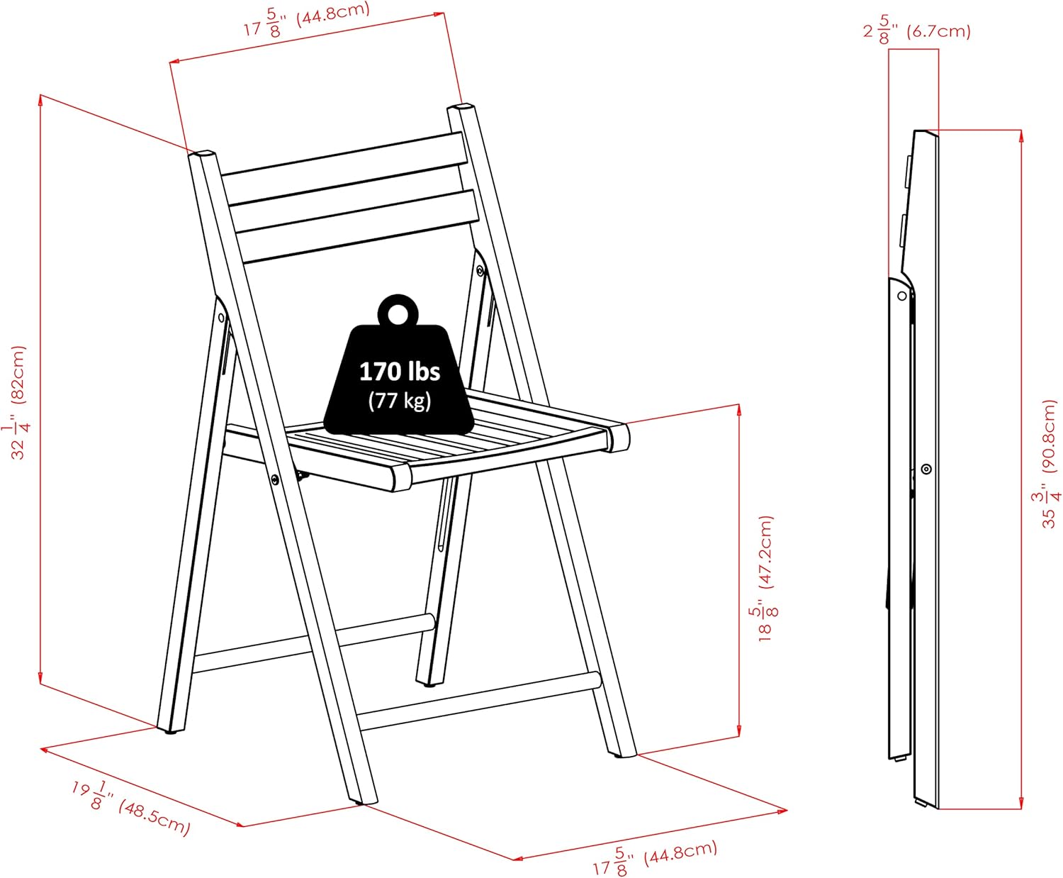 The Robin 4-PC Folding Chair Set in Teak finish have never looked so handsome. This 4-piece set of solid wood chairs is an indispensible addition to any home. Pull up the chairs for a card game or for extra seating around the dining table. Or bring them out when company comes over. The smooth seats are slatted and the double-bar backs give added support. The folded chairs tuck nicely against one another for compact storage. Finished in a rich Walnut. Overall size open is 32.25"H x 17.6"W x 20.1"D. No assembly required. Seat Height from floor : 17.4”, Seat Back Height : 14.90”, Seat Back Width : 17.60”,Seat Width : 15.19”